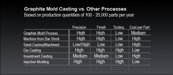 Compared to die casting, the Graphicast process has much lower tooling costs which can be amortized over shorter production runs. Graphicast castings also have a more homogeneous structure than die cast parts.