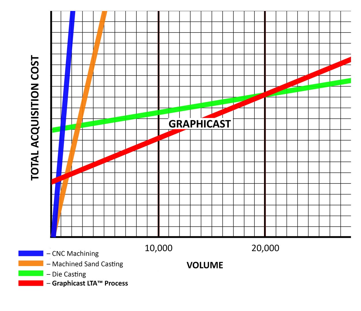 Graphicast’s proprietary LTA™ process yields lower total acquisition cost for production volumes of 100 to 20,000 parts per year. More info on our low and medium volume manufacturing process available here.